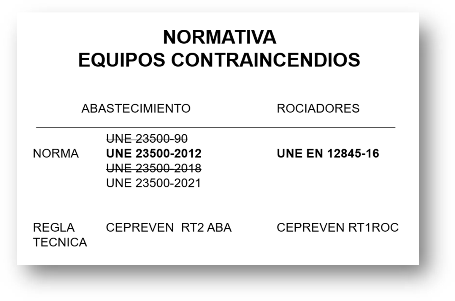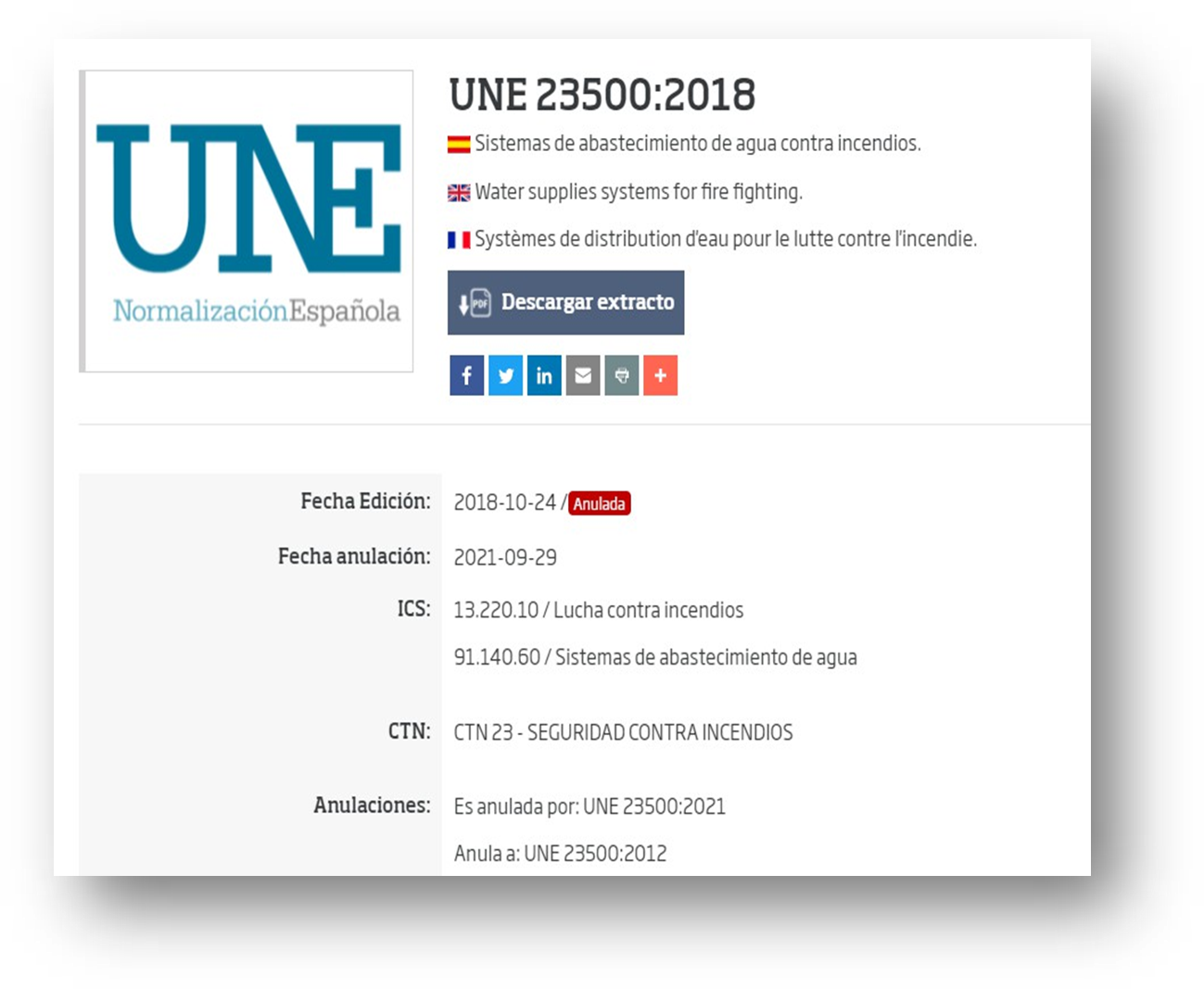 Por ello debemos de distinguir entre norma UNE aplicable a las instalaciones y norma UNE válida y vigente como tal norma UNE. Así, la norma UNE 23500-21 establece la anulación expresa de la norma UNE 23500-18 pero la de aplicación en las instalaciones sigue siendo la UNE 23500-12.